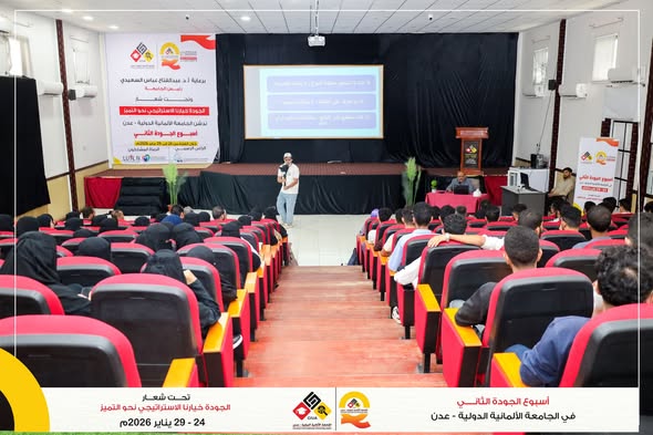 ضمن أنشطة اليوم الثاني من أسبوع الجودة الثاني في الجامعة الألمانية الدولية – عدن، تُقام محاضرة علمية يقدّمها أ. د. عبدالوهاب عوض كويران