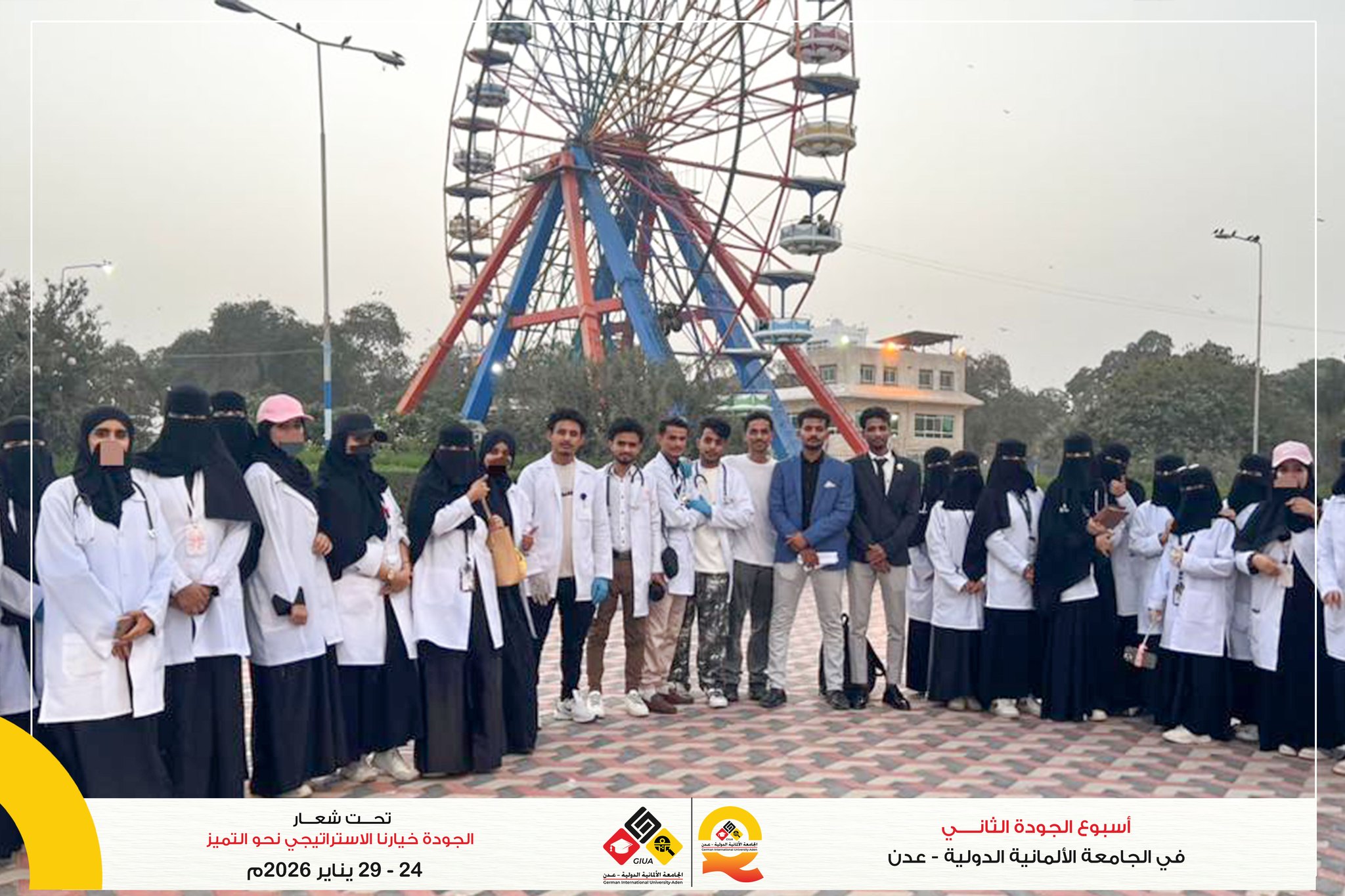 ضمن أنشطة أسبوع الجودة الثاني في الجامعة الألمانية الدولية – عدن، وتجسيدًا لقيم المشاركة المجتمعية نفّذ طلاب كلية الطب والعلوم الصحية التطبيقية بالجامعة الألمانية الدولية – عدن نزولًا ميدانيًا إلى ملاهي عدن (الكمسري)، بمشاركة طلاب من كل أقسام الكلية، وقدموا للمجتمع خدمات طبية شملت فحوصات الملاريا وفصائل الدم وضغط الدم والسكر، إضافة إلى فحوصات التنفس والتوعية بصحة الرئة، في مبادرة إنسانية تعكس التزام الجامعة بخدمة المجتمع وترسيخ مفهوم الجودة كعمل ميداني مؤثر.